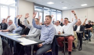 Präsidentin Sandra Elliscasis zeigte sich in ihrer Begrüssung sichtlich erfreut über den sehr guten Besuch. Der Tagungsort hat seine Attraktivität offensichtlich ausgespielt. Entsprechend gut gelaunt nahm die Versammlung die Anträge des Vorstandes entgegen und genehmigte oppositionslos die Statutenänderung, die angepassten Mitgliederbeiträge, das Budget 2018 sowie die Wahlvorschläge. Sandra Elliscasis wurde mit Dank und Applaus für ein weiteres Jahr als Präsidentin gewählt, ebenso die bisherigen Vorstandsmitglieder Pascal Käser, Christoph Reis, René Heusser und Marc Zimmermann. Martin Schmucki und Arthur Hächler – Vorstandsmitglieder der ersten Stunde – hatten ihre Demission eingereicht und wurden mit Präsenten und Dank für ihren jahrelangen, initiativen Einsatz verabschiedet. An ihre Stelle wählte die Versammlung Luzia Rast und Ramon Strittmatter (Generalagent „die Mobiliar“).