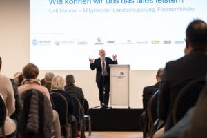 Für den Schweizerischen Finanzminister aus Hinwil war es ein Heimspiel, das er gerne nutzte und auch zu nutzen verstand, um die finanzielle Lage sowie die Aufgaben der Eidgenossenschaft von heute und morgen zu durchleuchten, zu analysieren und dem vollen Saal interessierter Zuhörer näher zu bringen.