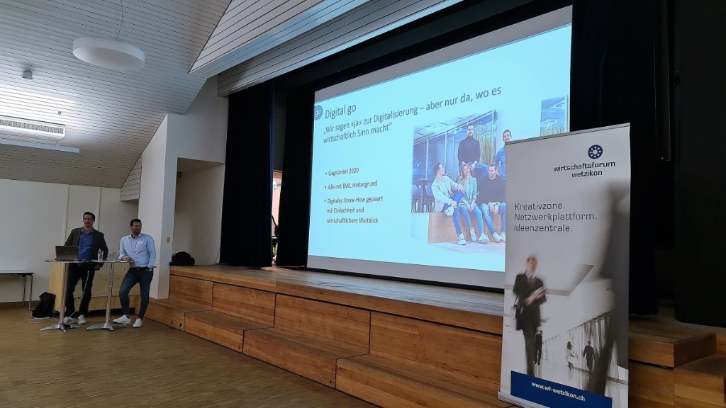 Unsere Präsidentin, Sandra Elliscasis, durfte anlässlich des Anlasses des Wirtschaftsforum Wetzikon am letzten Donnerstag im Kronensaal Wetzikon rund 40 Personen zum Thema «Der digitale Boom und seine Chance, diesen zu nutzen» grüssen. Den beiden Referenten des 2020 gegründeten Start-up’s Digital Go, Marco Kohler und Oliver Kuhn, gelang es rasch, die Teilnehmer mit Fakten zum digitalen Konsumverhalten verschiedener Altersgruppen in das Thema einzuführen. Rasch wurde klar, dass sich der digitale Konsum, gerade in den beiden vergangenen Jahren gepuscht durch Corona, rasch zugenommen hat. Headlines wie «Pandemie beschleunigt Digitalisierung bei Schweizer KMU» waren nicht nur im Zusammenhang mit Homeoffice zu lesen, sondern zeigten sich vielerorts auch in den steigenden Umsatzzahlen bei Apple, Google und Microsoft & Co. Aber was hat das alles mit uns zu tun? Heute sprechen wir über ein sogenanntes «Digitales Schaufenster», welchem wir uns in verschiedensten Anwendungen bedienen. Denken wir nur an die Mobilität, wo wir uns mittels App nicht nur Tickets für den öffentlichen Verkehr besorgen, sondern auch das Angebot von Uber nutzen: Alles läuft digital ab, einzig die Fahrt selbst läuft erfolgt auf physischer Basis. Gleiches erleben wir beim Online-Shopping oder sehen wir in der Automatisierung im Bereich der Industrie. Sandra Elliscasis erwähnte es schon im Begrüssungsteil, dass selbst sie als Mensch der Ü50-Generation zwar ohne Portemonnaie das Haus verlässt, jedoch nie ohne Handy. Unsere Mobilegeräte sind zu einem ständigen und sehr persönlichen Begleiter geworden. Bereits das kleine Experiment der Anwesenden, das persönliche Handy entsperrt mit dem Nachbar zu tauschen, erfüllte manchen Teilnehmer mit Unbehagen.