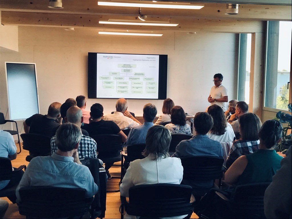 Sandra Elliscasis, Präsidentin vom Wirtschaftsforum, durfte fast 60 Personen willkommen heissen, die den Weg in die modernen und offen gestalteten Räumlichkeiten der Stadtwerke Wetzikon gefunden hatten. Das spannende Programm bestand aus einem Referat von Franco Thalmann, Leiter Stadtwerke, mit anschliessender Betriebsbesichtigung und einem gemütlichen Netzwerk-Apéro.