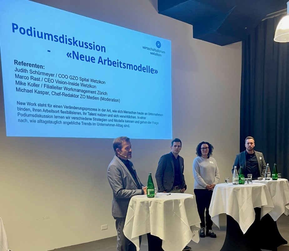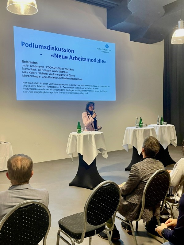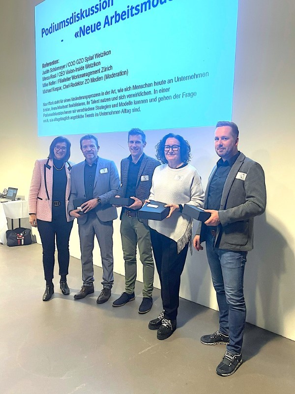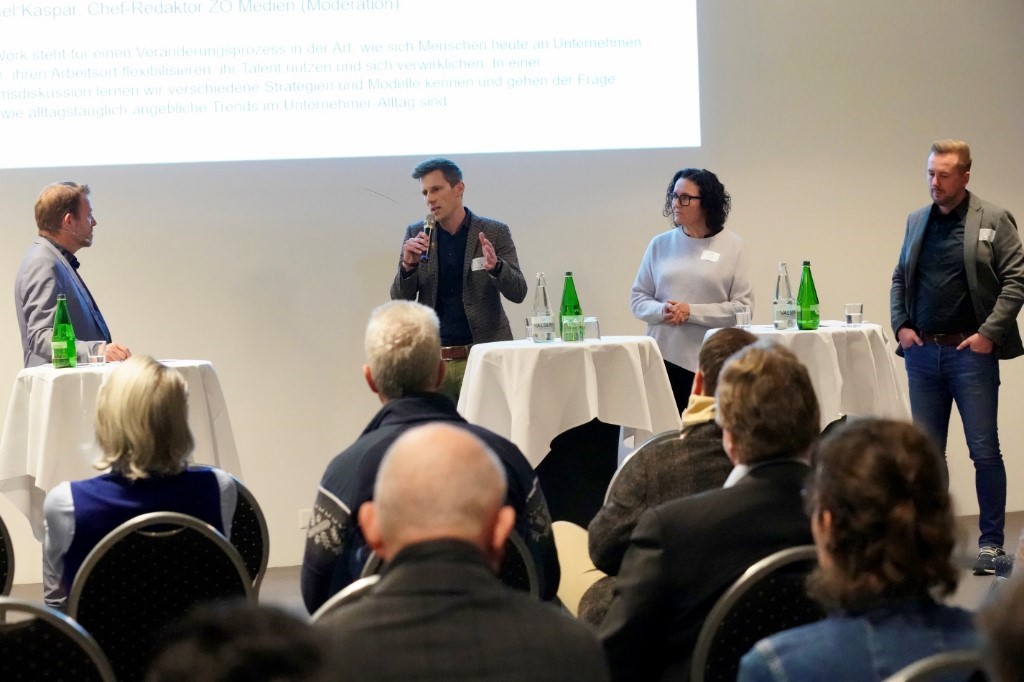 Dieser Anlass drehte sich um «Neue Arbeitsmodellen» und wurde im Rahmen eines Podiumsgesprächs durchgeführt. Michael Kaspar, Chef-Redaktor der ZO Medien AG, führte galant durch die Diskussionsrunde mit den drei Referenten Judith Schürrmeyer, Marco Rast und Mike Koller.